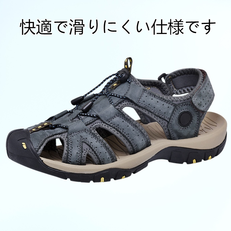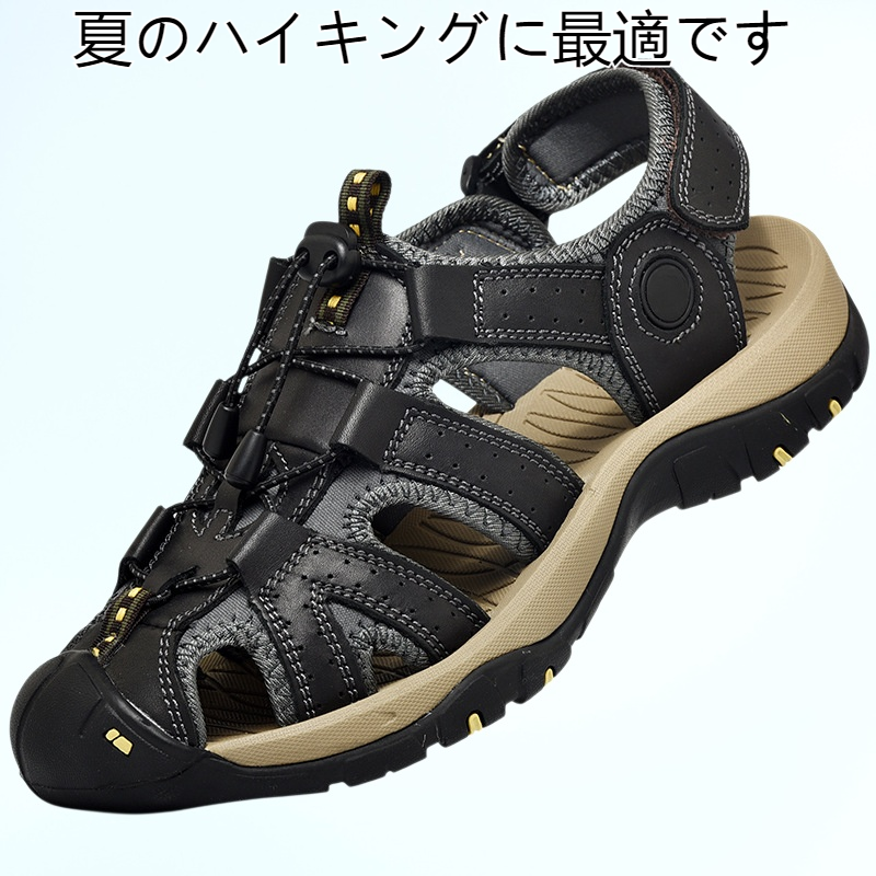 通気性抜群のつま先閉じデザイン。手作りの大きいサイズで快適な履き心地。滑り止め機能付きで夏のハイキングに最適なメンズサンダル。